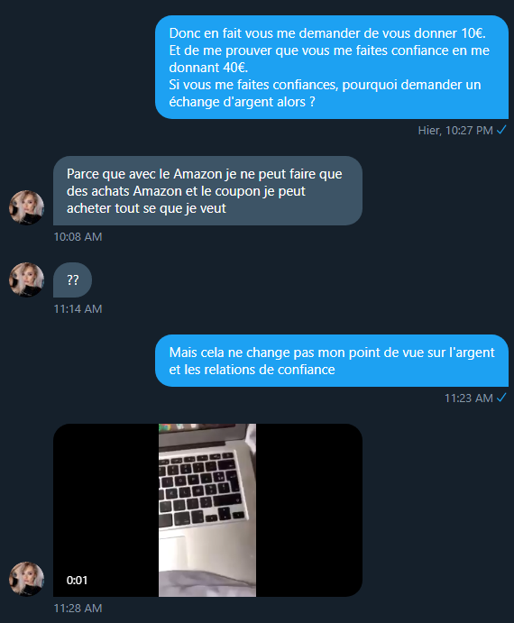 La vidéo on l'entend me dire qu'elle n'est pas fake et quelle n'en veut pas qu'à mon argent.