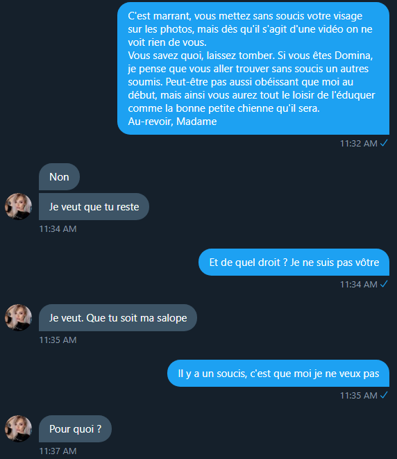 Lassé de me faire avoir, et commençant à en avoir l'habitude, je flair le coup fourré. Elle m'envoie des photos (vérifiée par mes soins, non trouvable sur le net c'est déjà ça). La discussion continue, mais elle revient sans arrêt sur "Tu veux être mon esclave".