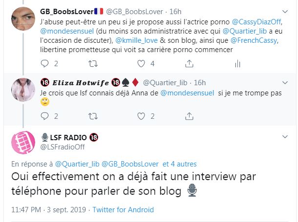 Hier soir, je leur ai proposé des noms parmi mes abonnés Twitter, pour leurs interviews ou passages à la radio. J'ai même proposé le Monde sensuel d'Anna, mais Anna @admin a déjà été interviewé par cette radio par téléphone.
