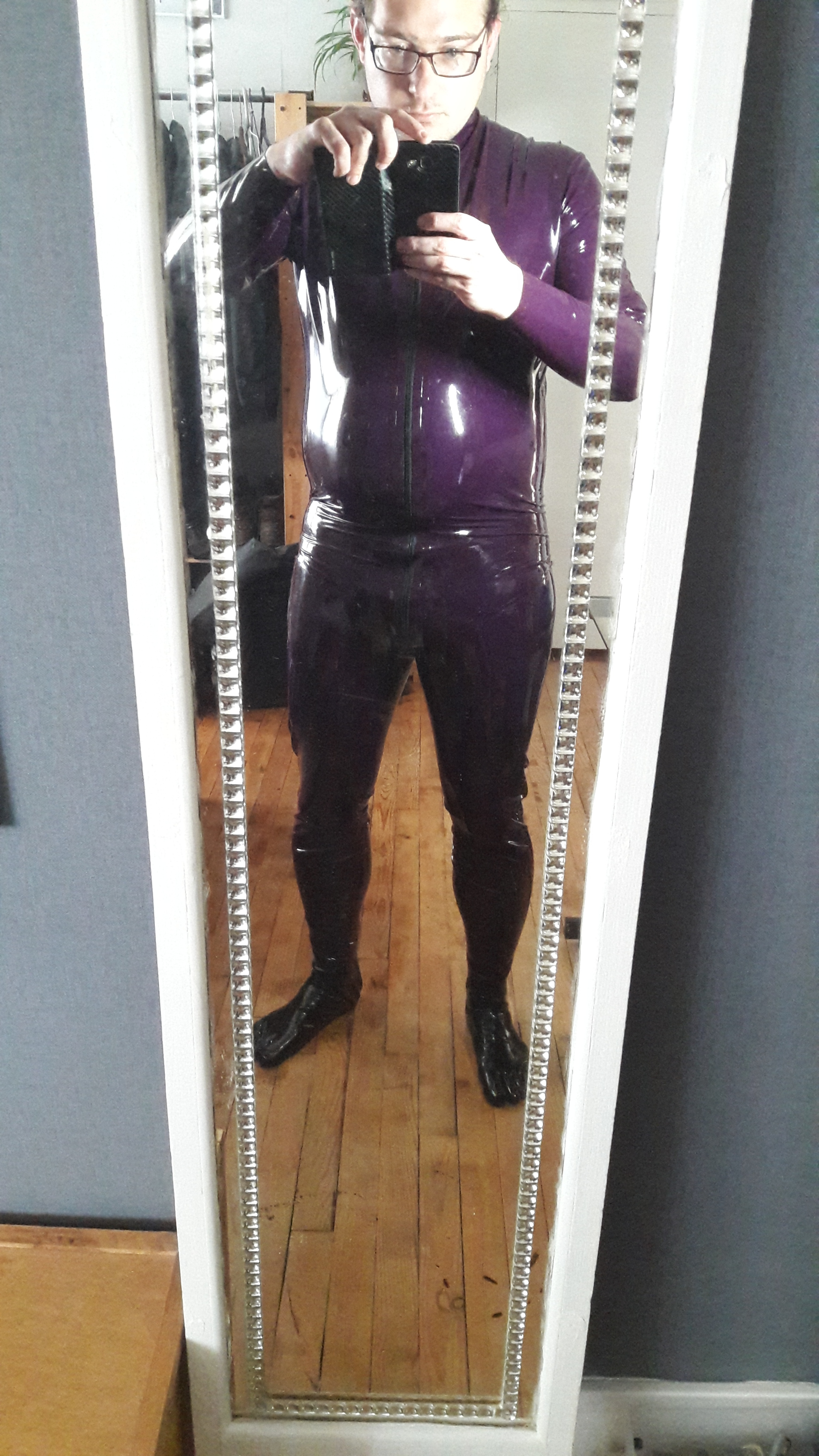 Le rouge foncé et le violet sont mes couleur préférée en latex, surtout associé au noir cela les mets encore plus en valeur. Même si le pantalon-gilet est particulièrement bien porté ^^