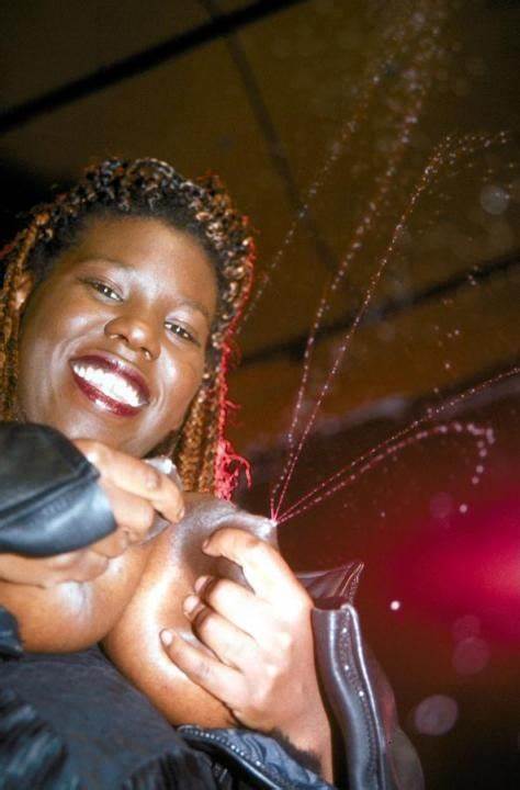 Femme de couleur utilisant ses seins énormes comme des revolvers :