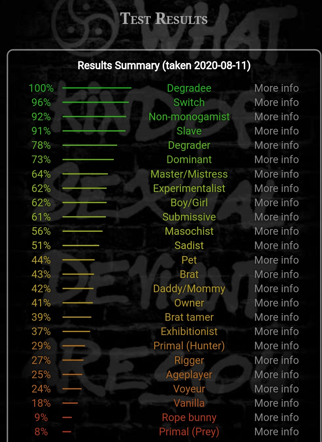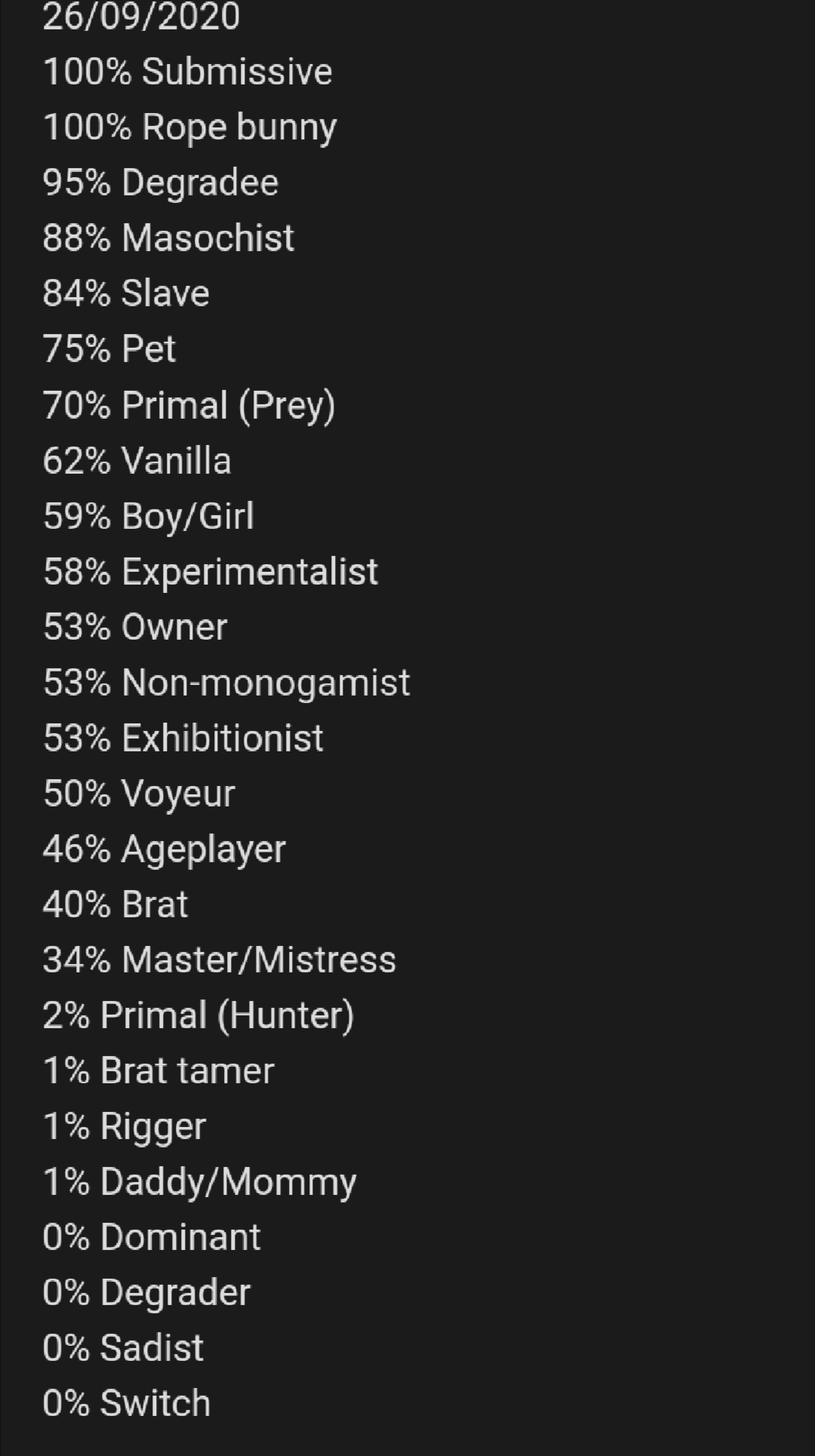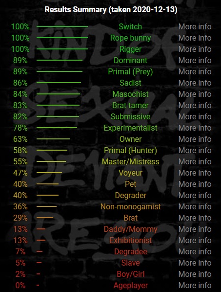 Il y a un site internet où l'on peut faire un test BDSM (en anglais ou alors une version plus courte traduite en français) pour savoir si on est plus dominant ou soumis, sadique ou masochiste, maître ou esclave, proie ou prédateur, voyeur ou exhibitionniste etc en répondant à quelques questions.