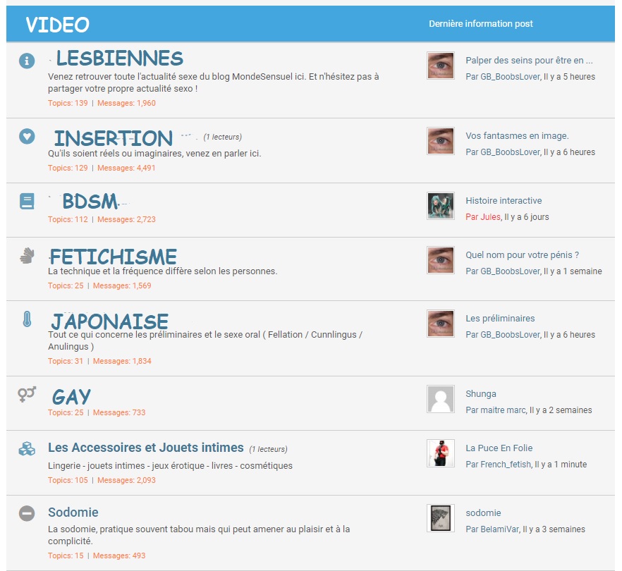 La première étant une nouveau forum (exemple : BDSM, hentai, rencontres, vidéo) et qui va posséder plusieurs sous catégories.